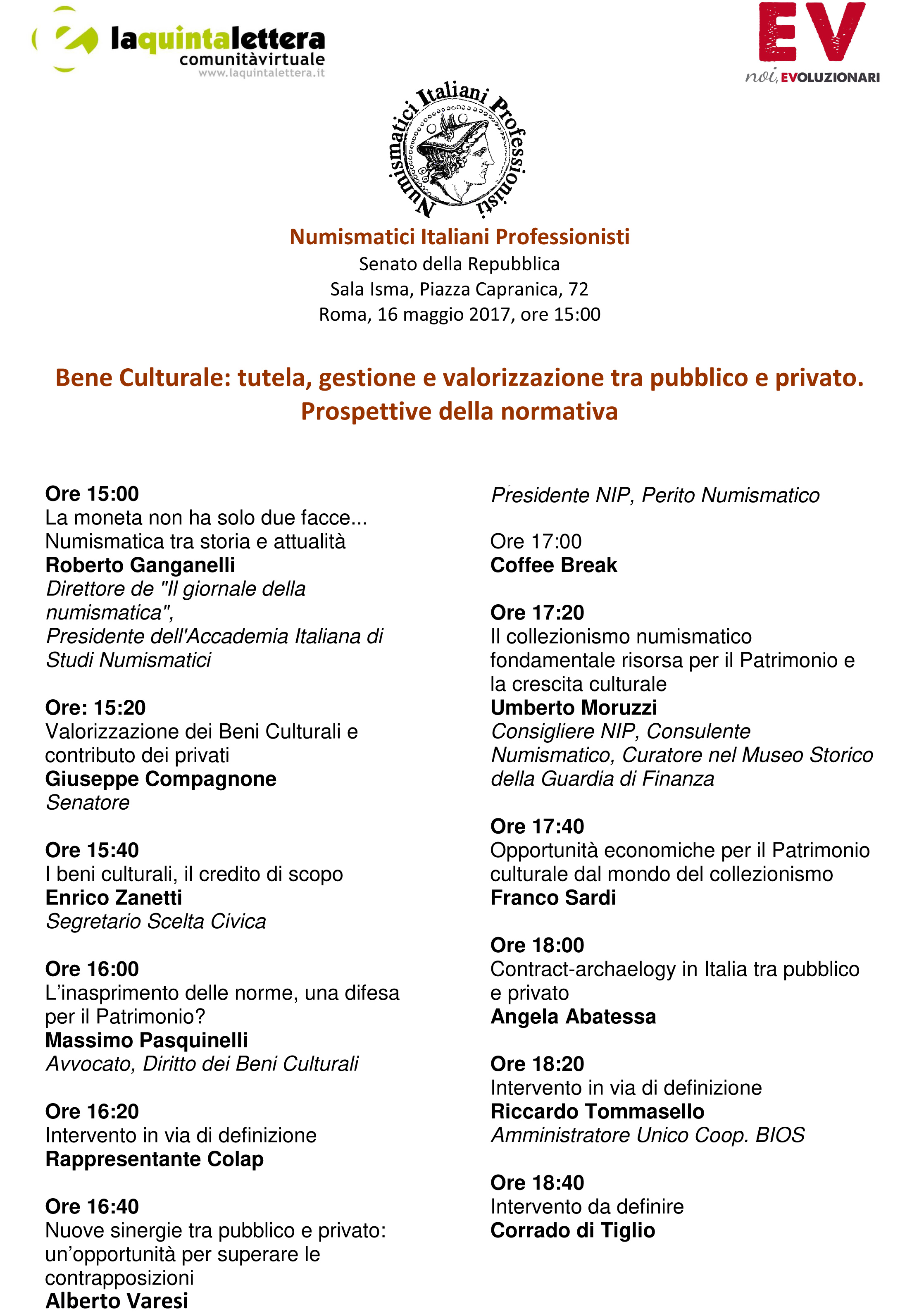 La prima relazione sarà tenuta dal presidente Alberto Varesi sul tema “Nuove sinergie tra pubblico e privato: un’opportunità per superare le contrapposizioni”, aspetto che sarà poi approfondito anche da Umberto Moruzzi, consigliere NIP e curatore nel Museo Storico della Guardia di Finanza (“Il collezionismo e il professionismo numismatico: risorse fondamentali per il Patrimonio e la crescita culturale”). Seguirà un intervento di Franco Sardi, docente di Legislazione ed Economia dei Beni Culturali dal titolo “Il professionismo numismatico: una protezione reale del patrimonio monetario”.