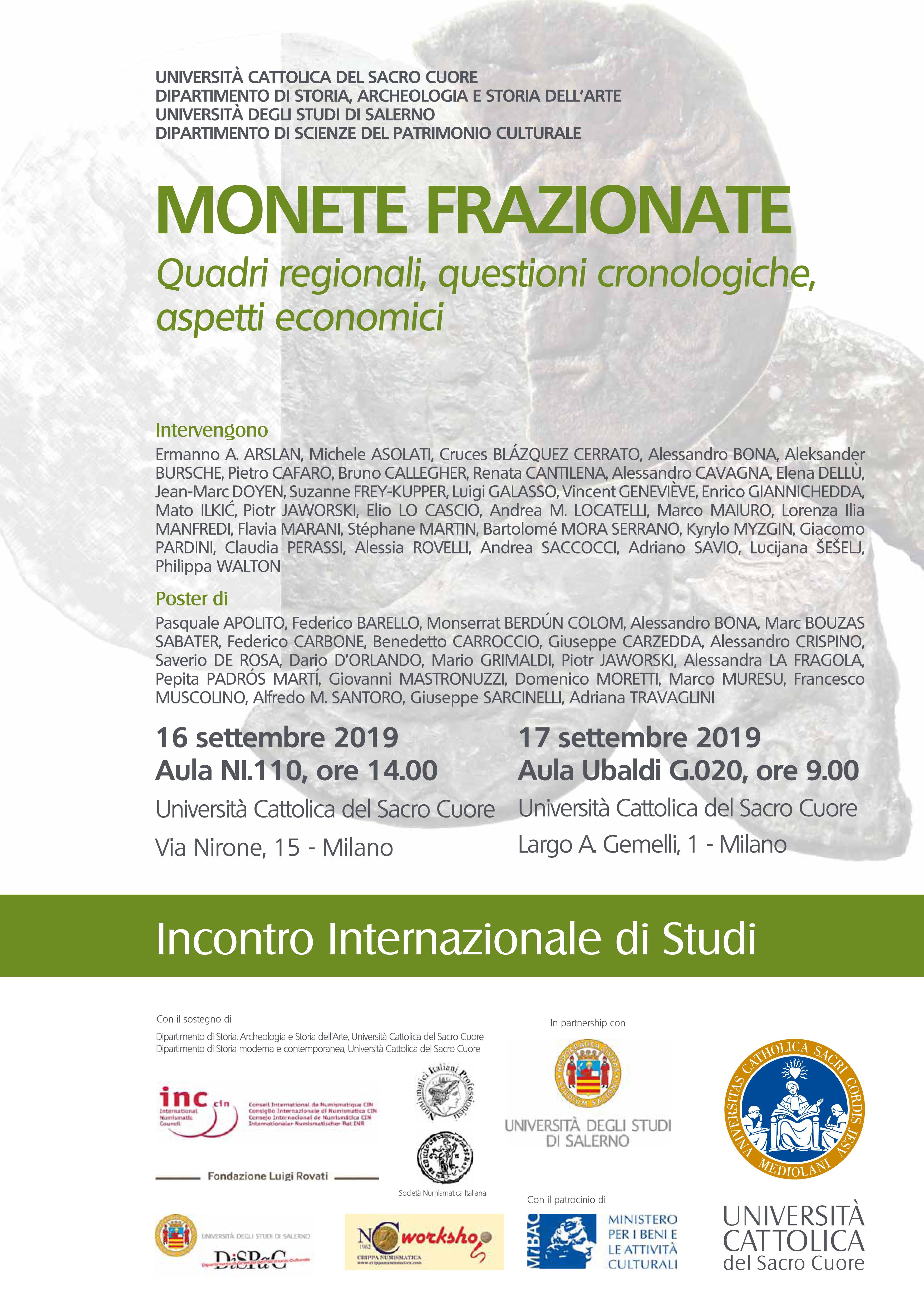 Anche i Numismatici Italiani Professionisti hanno contribuito all'organizzazione dell'evento sulle Monete frazionate. Aspetti economici, questioni cronologiche, quadri regionali, che si è svolto il 16 e 17 settembre 2019 presso l’Università Cattolica di Milano, organizzato dall’Università Cattolica del Sacro Cuore di Milano e dall’Università degli Studi di Salerno. L'incontro intende affrontare la riflessione su una particolare categoria di monete, ossia quegli esemplari deliberatamente spezzati in due o più porzioni nel corso della loro circolazione, con la finalità di originare due o più monete, in periodi di insufficiente approvvigionamento di nominali divisionali da parte delle zecche", come spiegano gli organizzatori. Un fenomeno diffuso in varie epoche storiche, soprattutto nella tarda Repubblica romana o nel primo Impero.