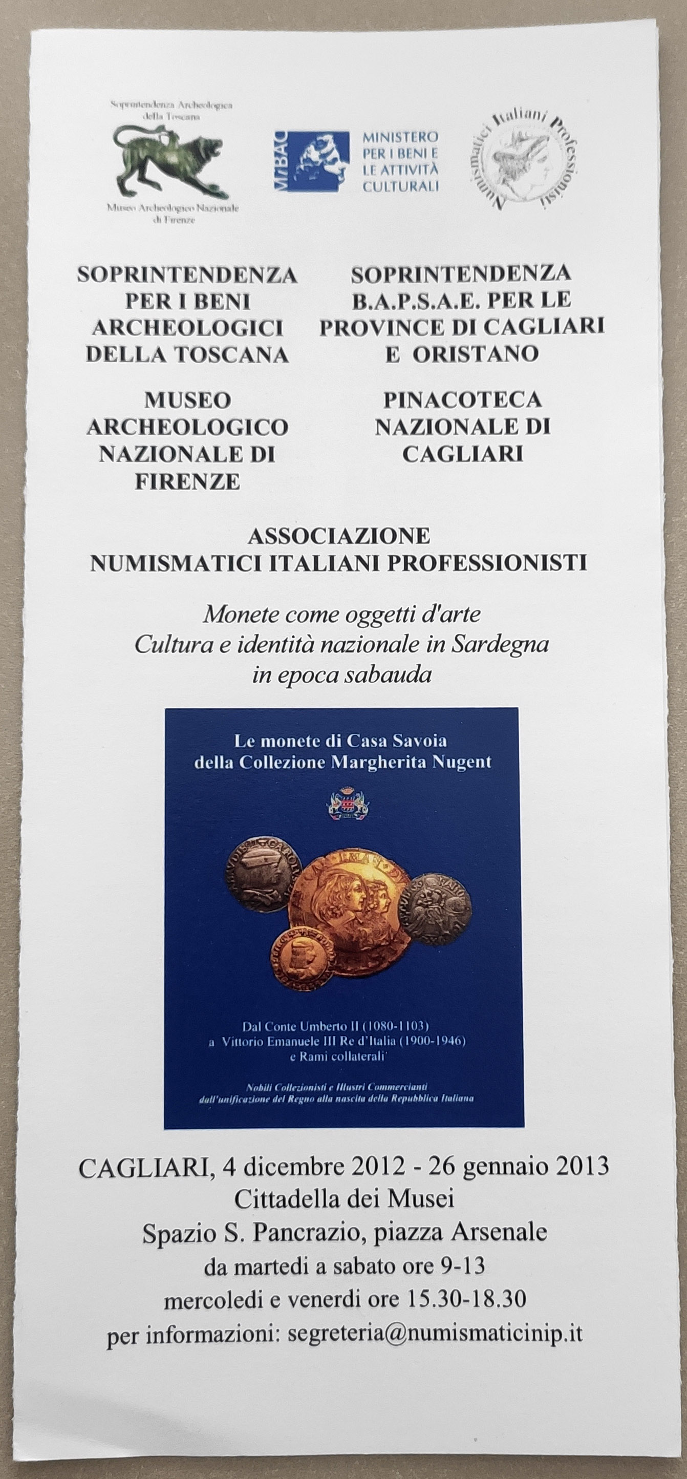 Dopo la positiva esperienza di Vicenza, la mostra della collezione numismatica Nugent si sposta in visione a Cagliari dal 4 dicembre 2012 al 26 gennaio 2013, confermando ancora una volta la fervida collaborazione tra pubblico, professionisti e privati.