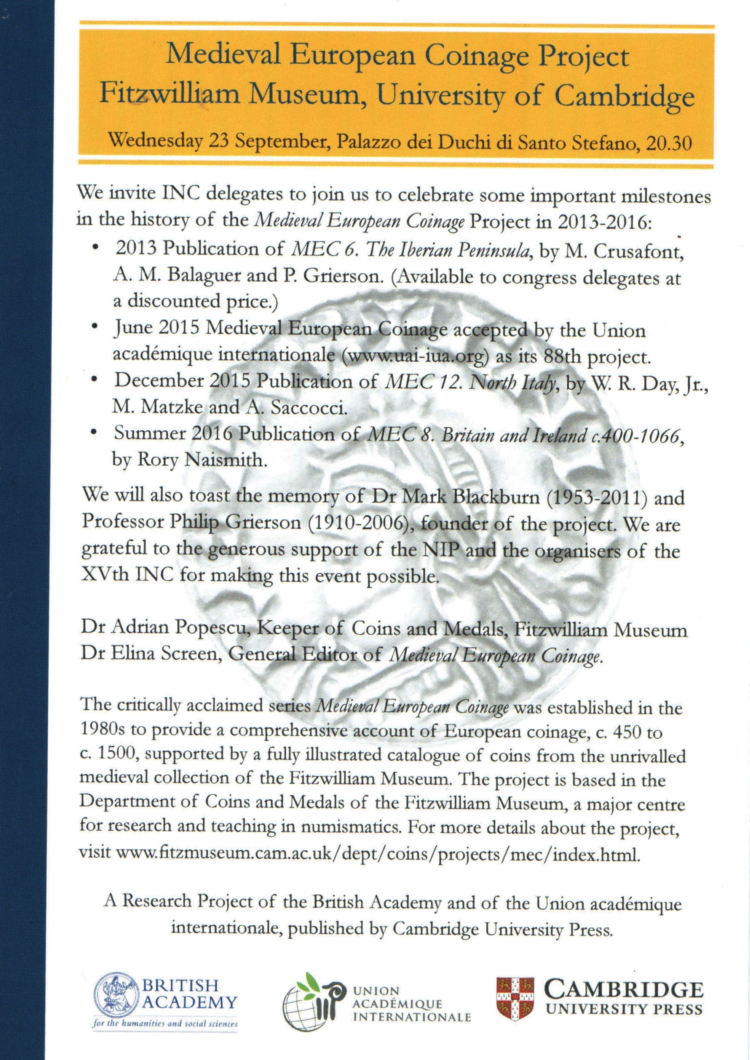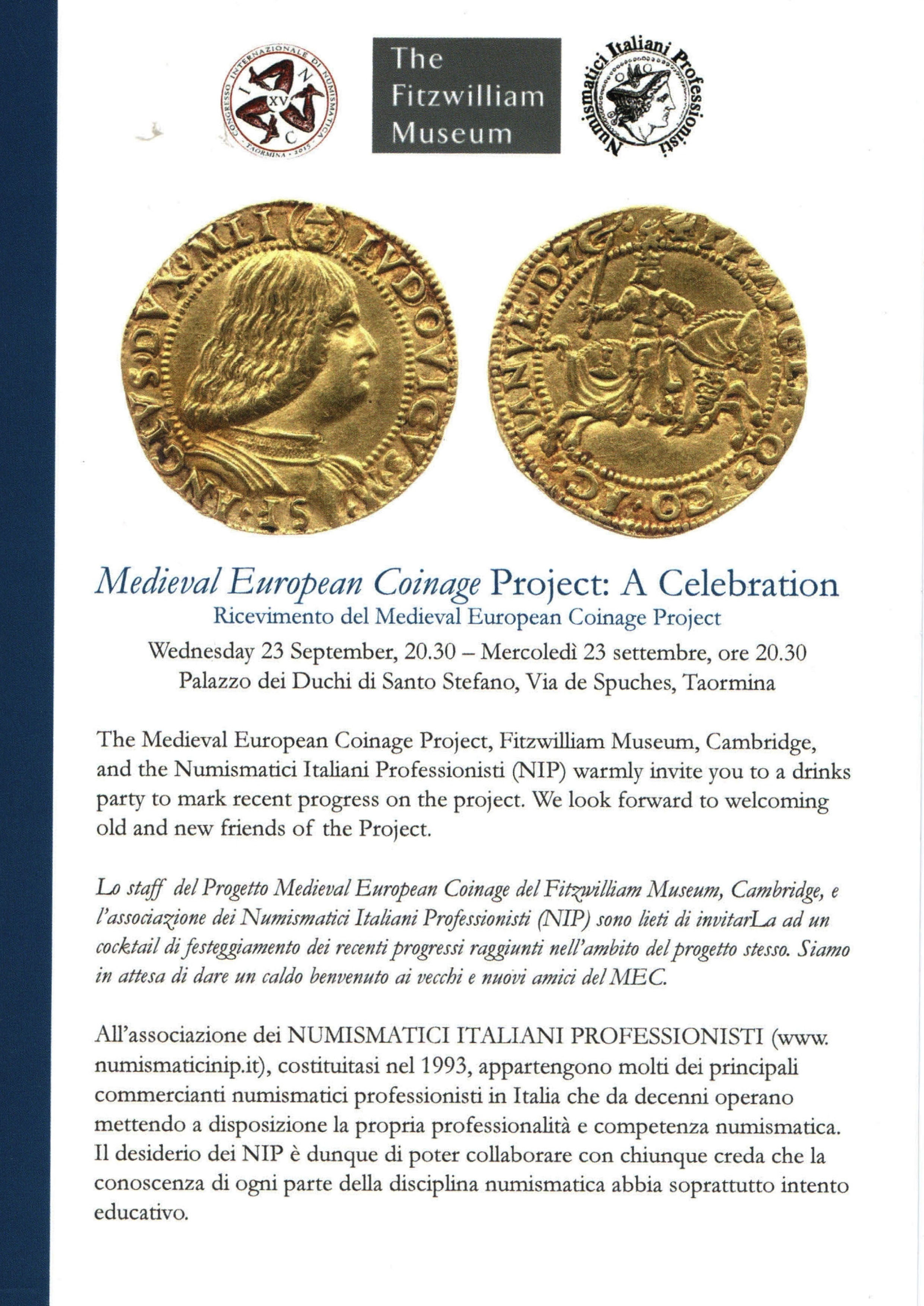 La NIP partecipa al XV Congresso Internazionale di Numismatica a Tormina come sponsor della cerimonia di festeggiamento del "Medieval European Coinage Project" organizzata dal Fitzwilliam Museum di Cambridge.