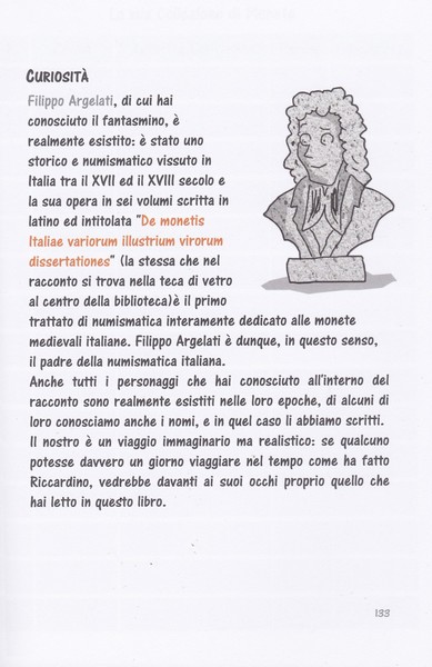 Si tratta di un piccolo libriccino con una veste da "giornalino" dedicato ad un pubblico di giovanissimi in cui abbiamo tentato di raccontare la Numismatica con un linguaggio e con una veste pensati per loro. Il racconto riguarda le avventure di un bambino bolognese di nome Riccardo: la casa dove abita è troppo piccola, così i genitori decidono di traslocare; gli hanno promesso una nuova casa più grande, con una stanza dei giochi tutta per lui, ma quando vede la casa, al posto della sua stanza trova una vecchia biblioteca polverosa abitata dal fantasmino di Filippo Argelati, padre della numismatica italiana, con cui percorrerà un entusiasmante viaggio nel tempo alla ricerca delle monete della sua collezione perduta. Nel loro viaggio nel tempo i due protagonisti si imbatteranno in falsari, nobili, imperatori, banchieri, collezionisti, mercanti e nell'oggetto che li accomuna tutti: la moneta! E' un libro che può creare i presupposti di un primo incontro di un bambino con la Numismatica e la storia...