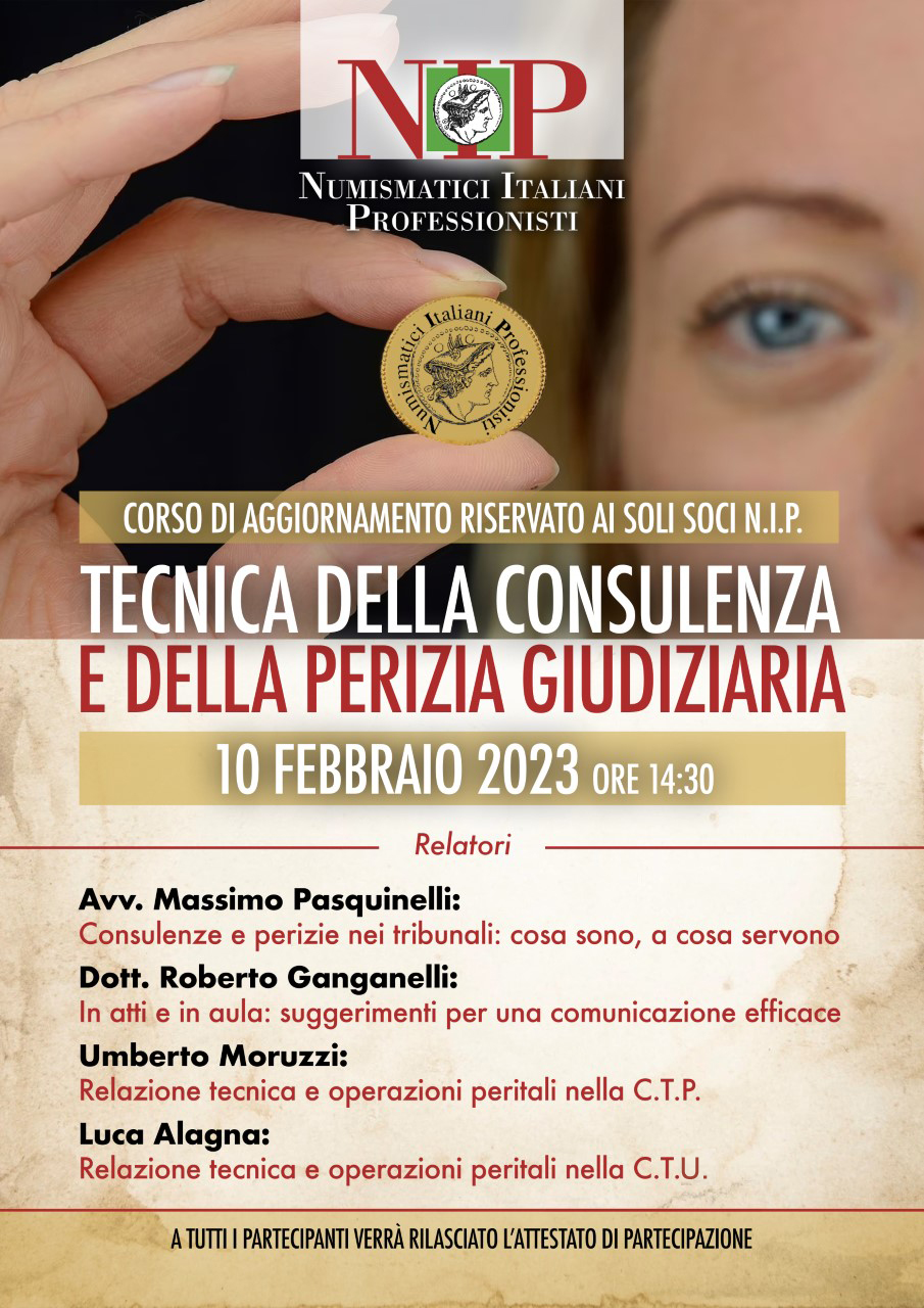 L'Associazione Numismatici Italiani Professionisti inaugura il primo corso di aggiornamento riservato ai soli soci in "TECNICA DELLA CONSULENZA e DELLA PERIZIA GIUDIZIARIA"